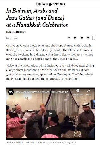 “Orthodox Jews in black coats and skullcaps danced with Arabs in flowing robes and checkered kaffiyehs at a Hanukkah celebration over the weekend in Bahrain, a Muslim-majority monarchy whose king has sanctioned celebrations of the Jewish holiday,” reads the first paragraph of the NYT report.