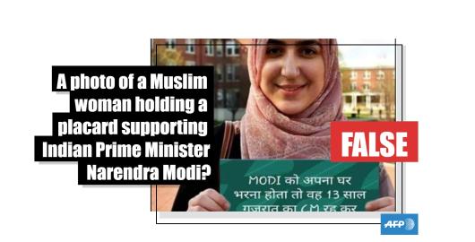Image Published on 12/03/2019 No, this is not a photo of a Muslim woman holding a placard in support of Indian Prime Minister Narendra Modi