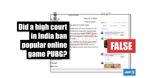 Image Published on 08/01/2019 No, a high court in India has not banned a popular online multiplayer game