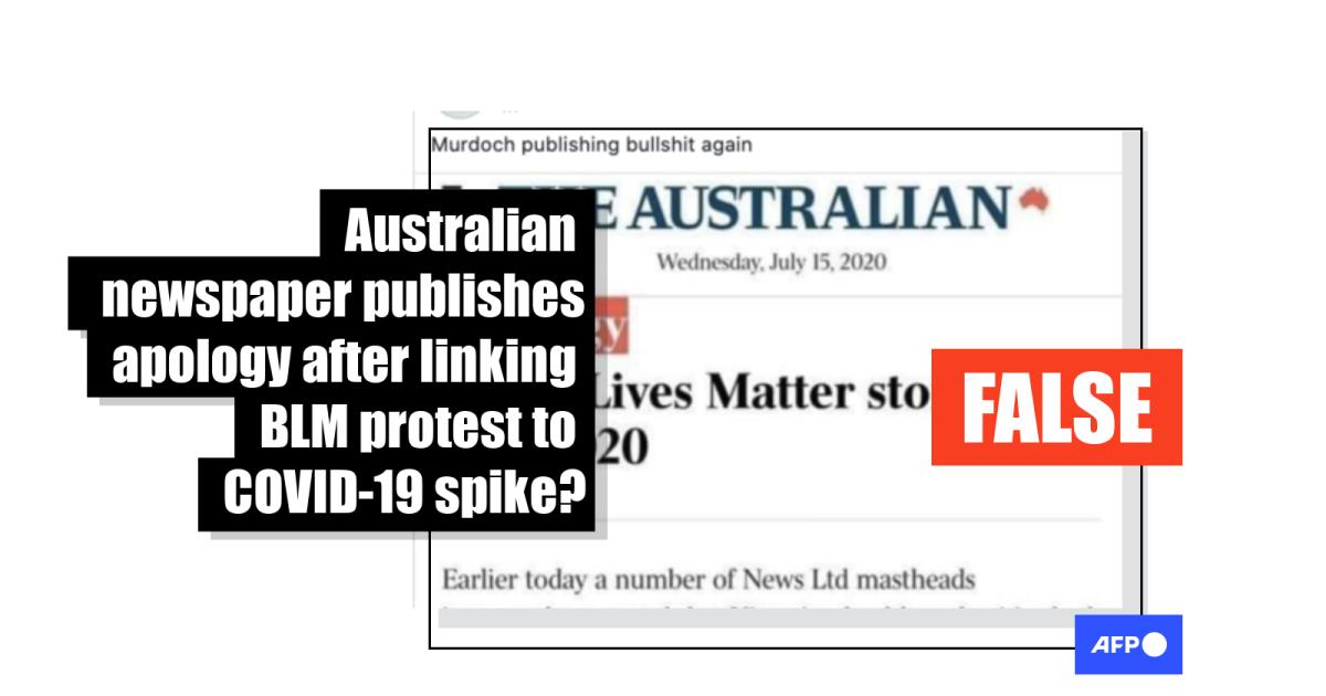 The Australian newspaper did not publish an apology over a report linking a Black Lives Matter protest with a COVID-19 outbreak in the country