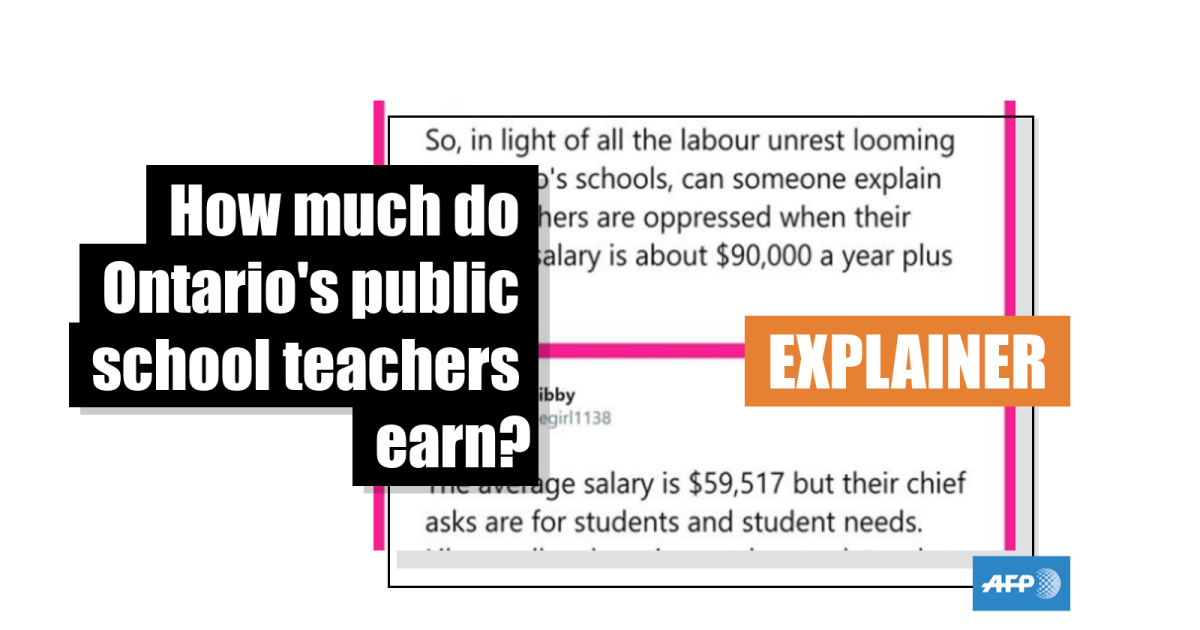 Contacted by AFP, the Ontario Ministry of Education stated that the average provincially funded teacher salary was Cad$90,469 in 2018-2019, and Cad$92,913 for high school teachers. These numbers are based on the salary grids as reported by school boards for this year.