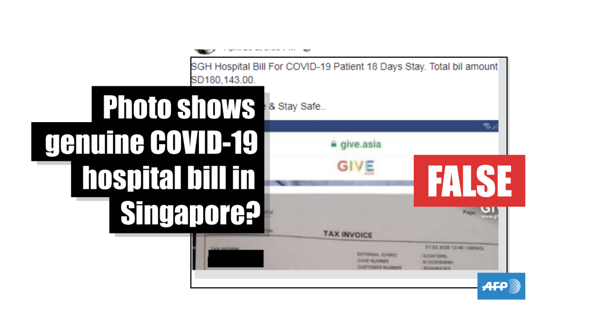 The photographed hospital bill is dated February 27, 2020 and bears SGH’s letterhead. A logo and a watermark for GIVE.Asia, an online fundraising platform, is also visible in the photo.
