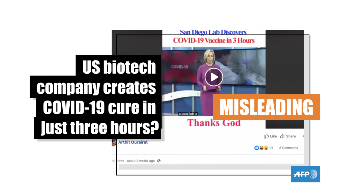 The news report features superimposed text that reads: “San Diego Lab Discovers COVID-19 vaccine in three hours. Thanks God”.