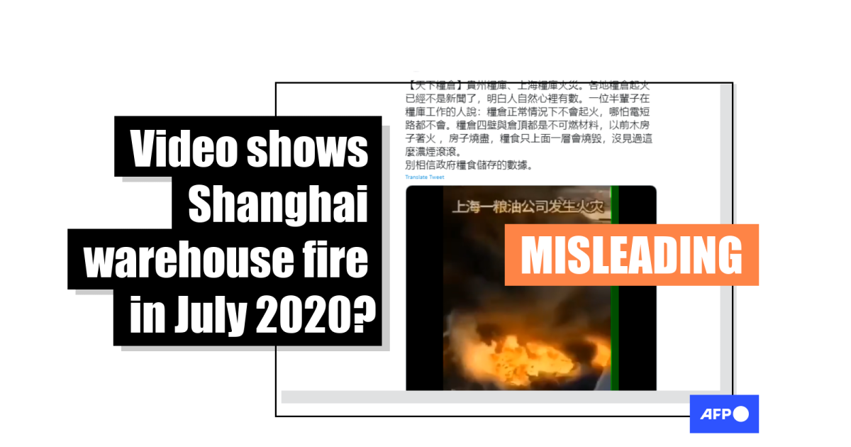 The traditional Chinese-language caption of the Twitter post translates to English as: “[Food reserves] Fires have been reported at grain depots in Guizhou and Shanghai, but similar fires that occurred at various grain warehouses across the country are not news. People with a clear mind would know what’s going on. To quote a person who worked at a grain depot half their life: ‘Grain depots don’t catch fire under normal circumstances, even if there is a short circuit, because their walls and roof are made of inflammable materials. Also, there were cases where wooden houses were burned to the ground, but the grains inside only had their surface scorched. I have never seen thick smoke and roaring fire like this, so don’t believe in information from the government about food reserves.”