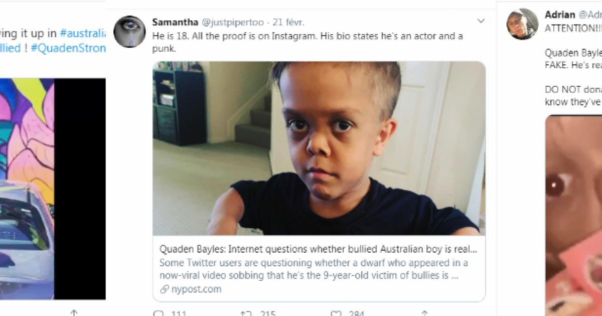 The tweet reads: “Quaden Bayles aka the ‘9 year old’ who was supposedly a bully victim is a FAKE. He’s really an 18 year old rich influencer.”