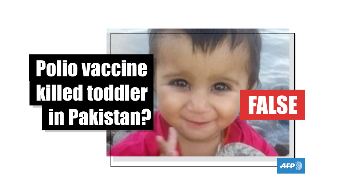 The photo was published in a Facebook post on August 26, 2019. It was shared more than 180 times before it was removed. The post showed a photo of an infant girl alongside a caption claiming that she died after being given the polio vaccine in the northwestern Pakistani town of Swabi.