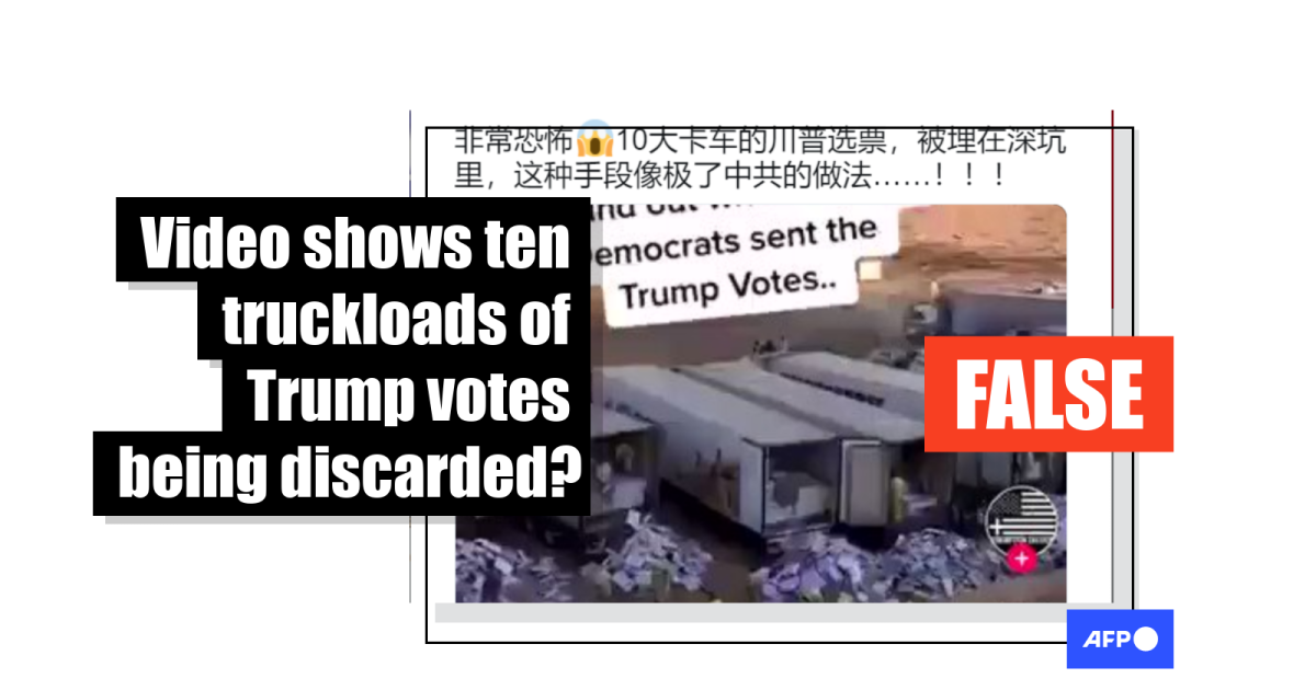 The Chinese-language caption translates to English in part as: “The 10 huge trucks of Trump votes are buried in a deep pit.”