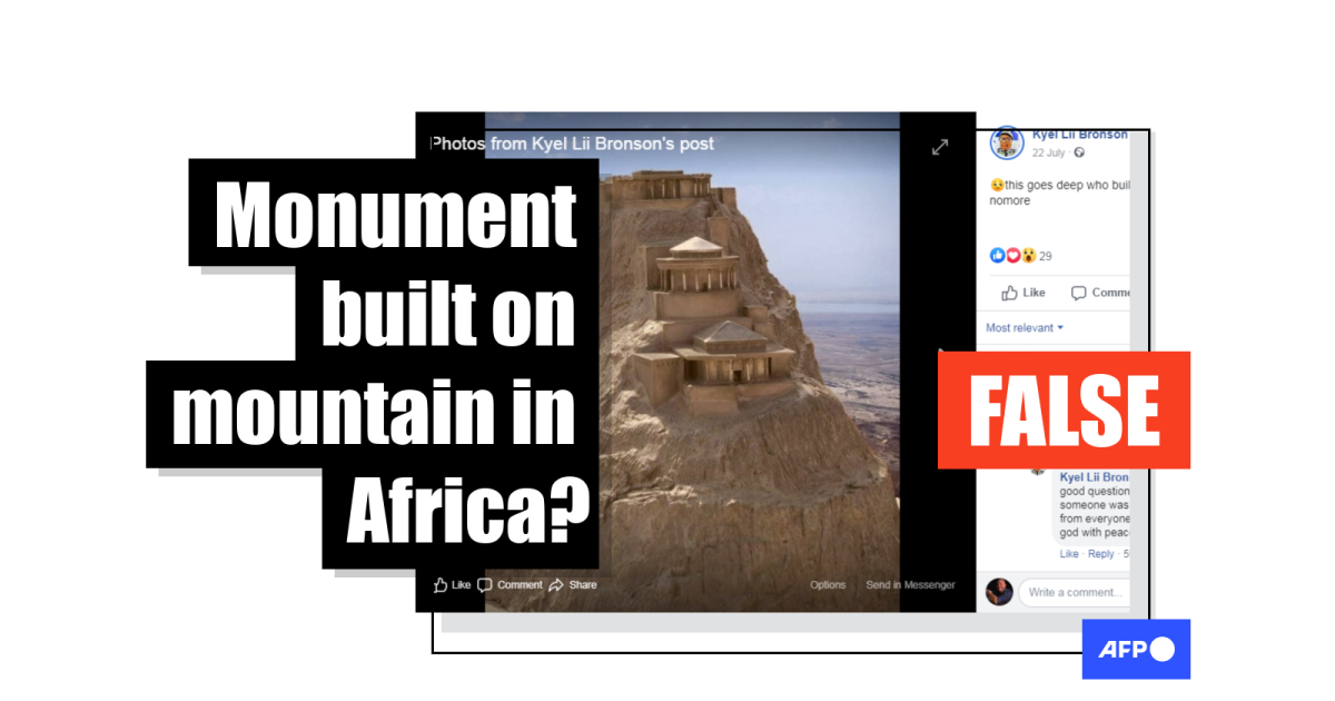 A Facebook post, archived here and published on July 22, 2020, includes an image of what looks like a monument perched on the side of a mountain surrounded by arid land. Shared dozens of times, the caption in the post asks “who built this in africa (sic)”.