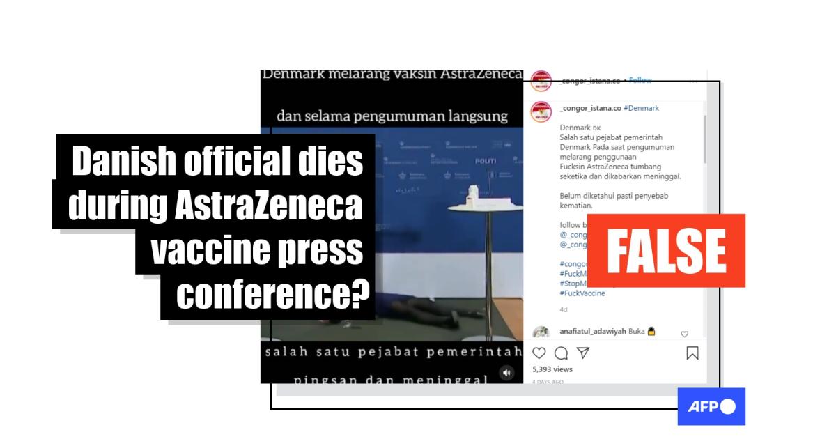 “Denmark bans AstraZeneca vaccine / while the announcement is ongoing / one of the government officials fainted and died,” the Indonesian-language text superimposed on the clip reads.