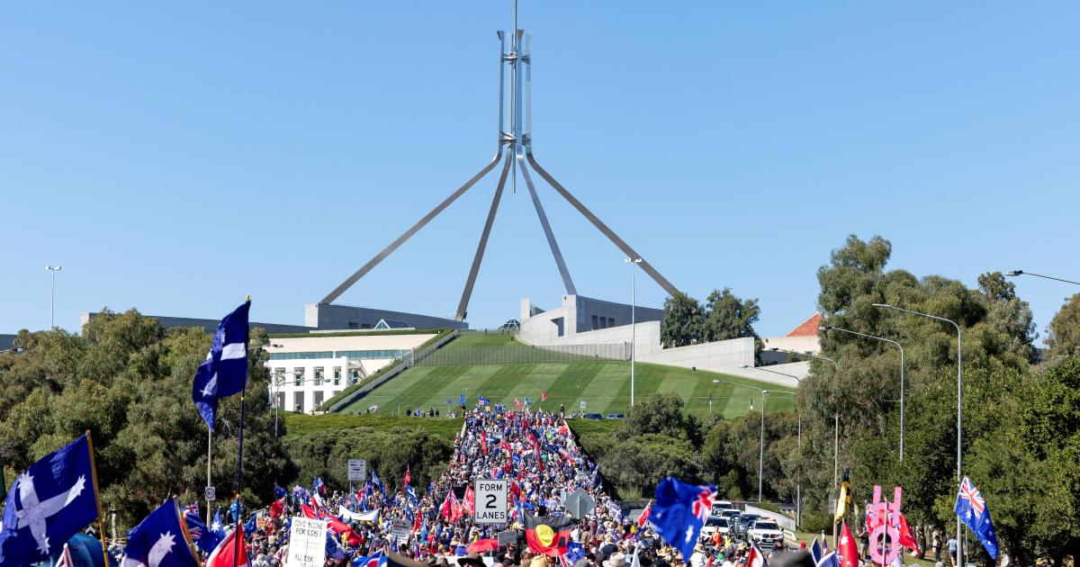 Reverse image searches found the photos shared in the post correspond with scenes from the Canberra protest, but the claim significantly overestimates the crowd size.