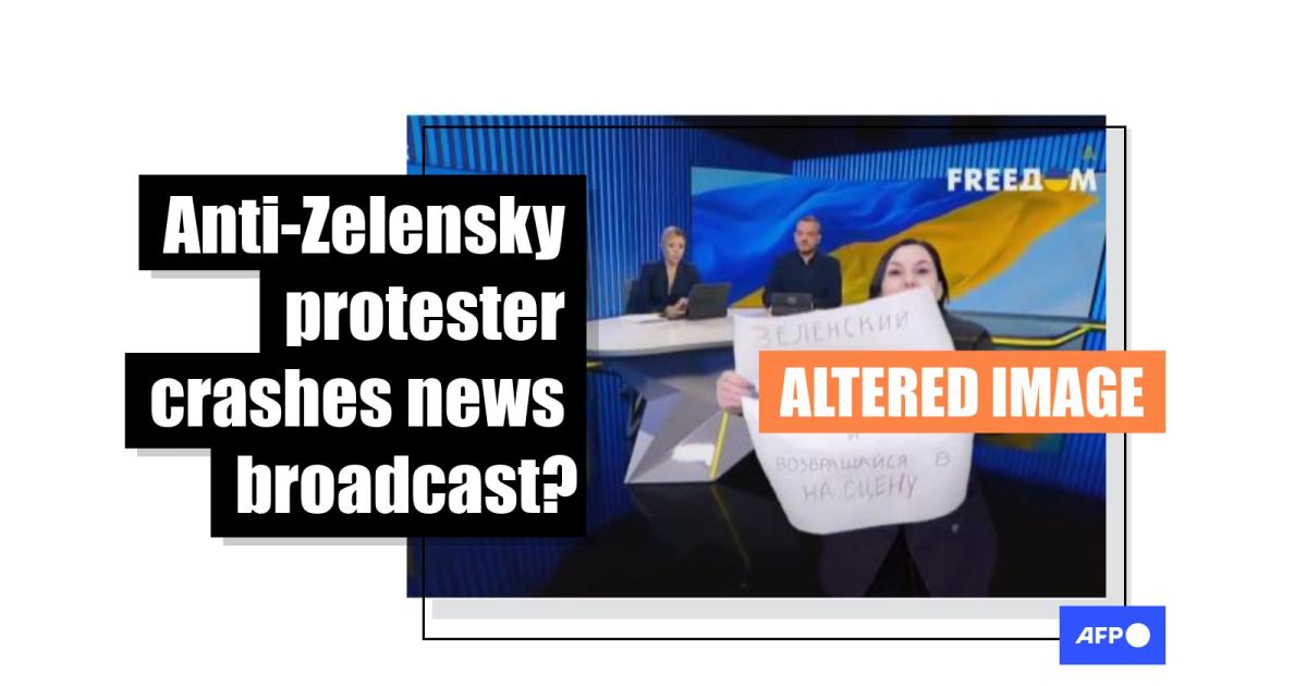 The picture shows a woman standing in front of two news anchors, holding a placard that reads: "Zelensky surrender, quit drugs and go back to the stage".