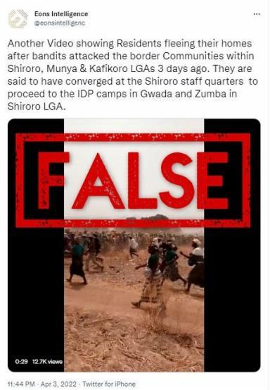The claim was published on the Twitter page of Nigerian online security news platform Eons Intelligence on April 3, 2022. Nearly 13,000 people viewed the video before the tweet was deleted.