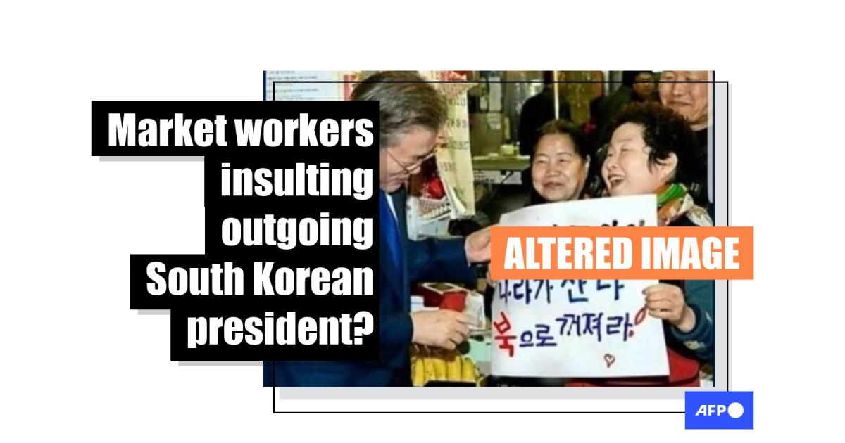 An image appearing to show outgoing South Korean President Moon Jae-in -- who pursued a policy of engagement with North Korea during his term -- confronted with a placard that says he "must die" and "screw off to the North" has been repeatedly shared in Korean-language social media posts. But the placard has been digitally doctored: it originally showed a message asking Moon to support local merchants.