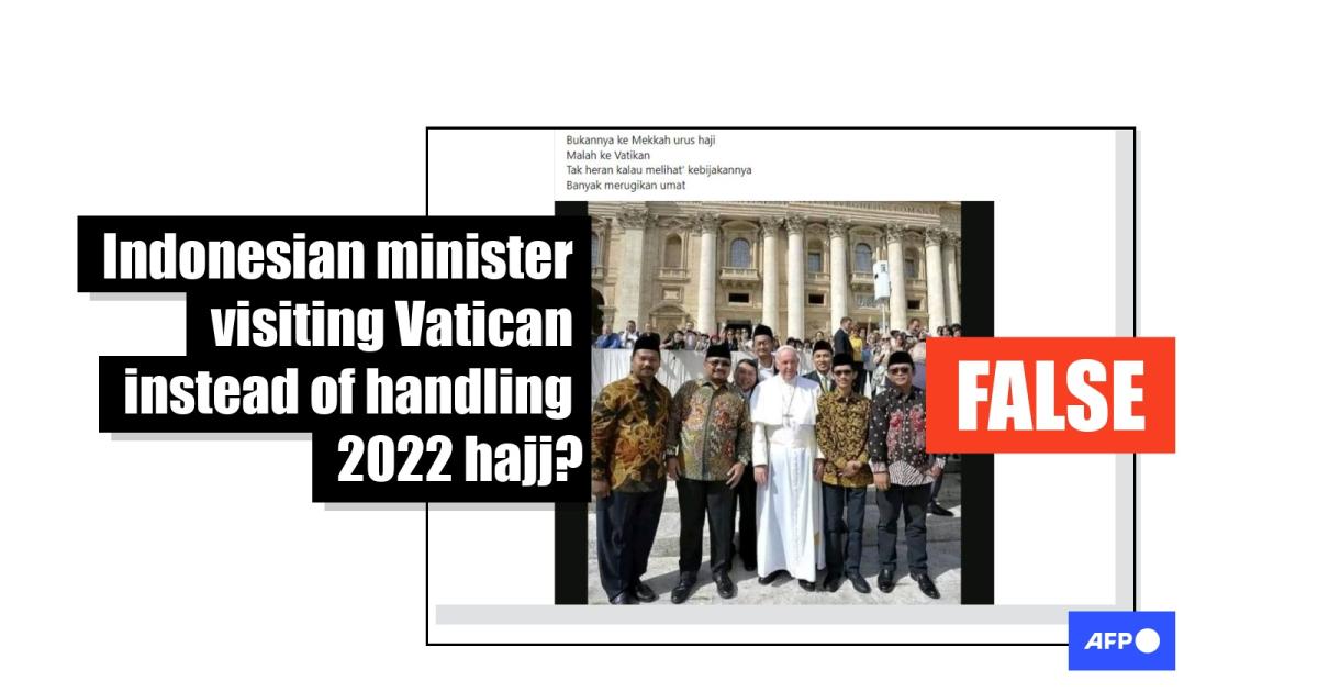 "Instead of going to Mecca to handle the hajj, he went to the Vatican. No surprise when you consider his policies that harm Muslims," reads the Indonesian-language caption to a picture shared on Facebook here on June 16, 2022.