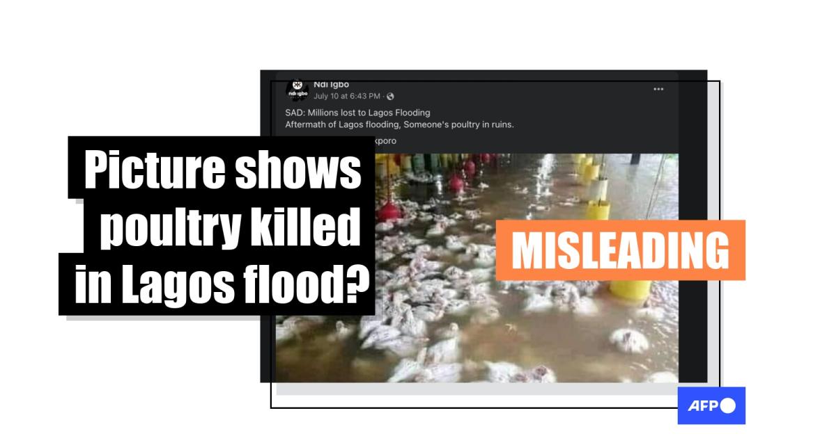 “Aftermath of Lagos flooding, someone's poultry in ruins,” claims a Facebook post published on July 10, 2022. The post includes a photo of what looks like a flooded commercial chicken facility and scores of birds overcome by high water.