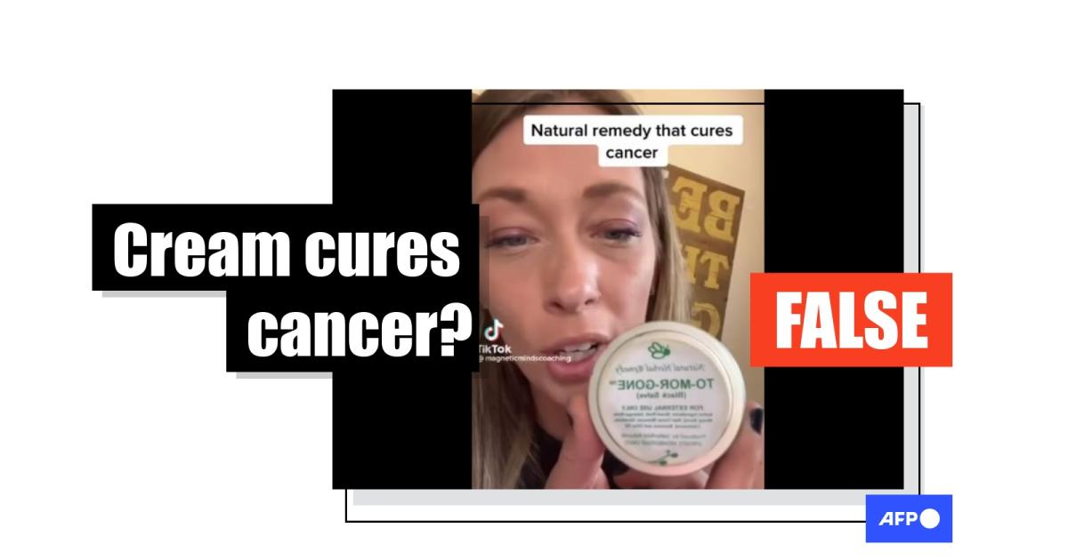 The clip, also found on Instagram, stems from a now-removed video on TikTok. It shows a woman promoting a product called "TO-MOR-GONE," with text saying the cream is a "natural remedy that cures cancer."