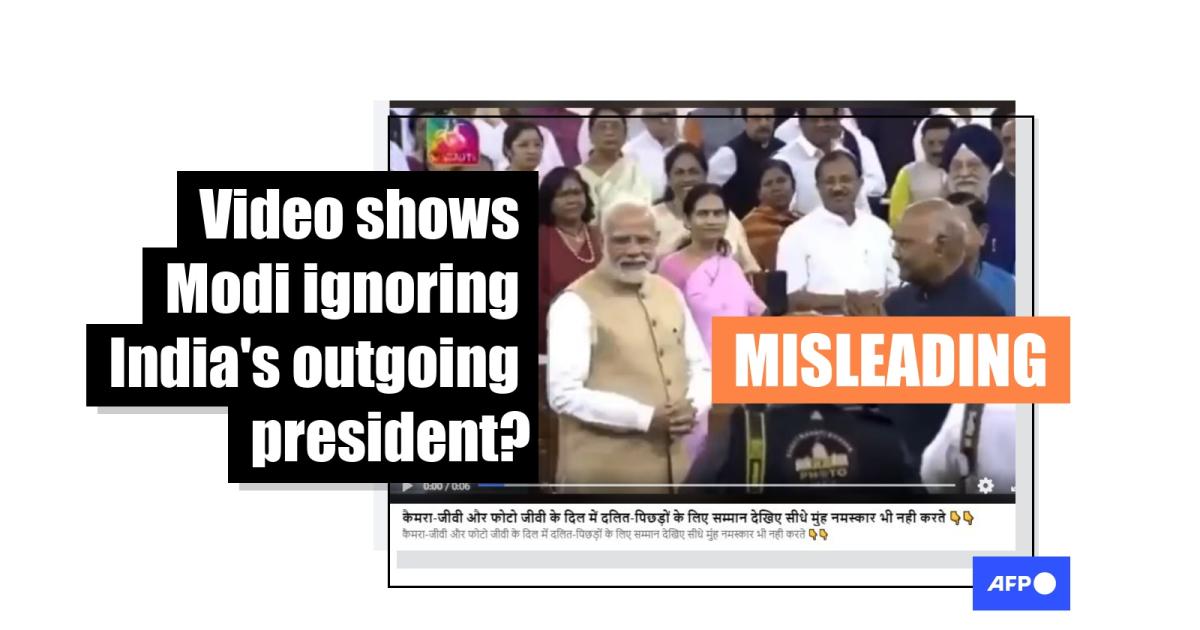 The clip, which has been viewed more than 129,000 times, shows former Indian president Ram Nath Kovind approaching and greeting Indian Prime Minister Narendra Modi, but it appears that Modi looks at the photojournalists and cameramen instead.
