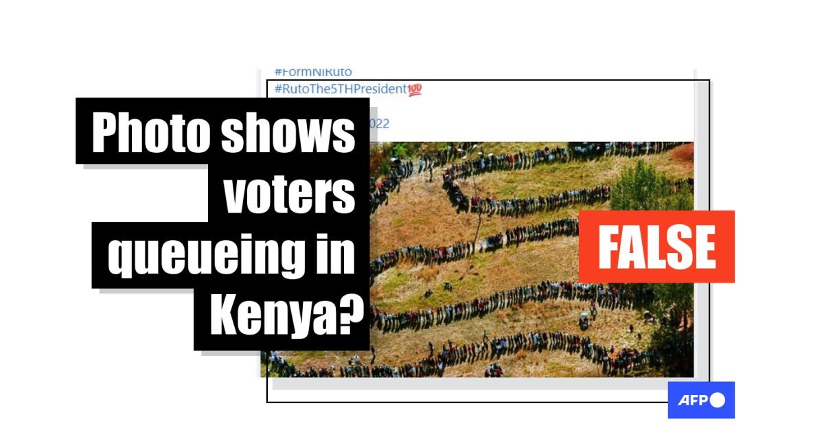 An aerial photo, published with the misleading post, shows a long, snaking line of people on a patch of open ground.