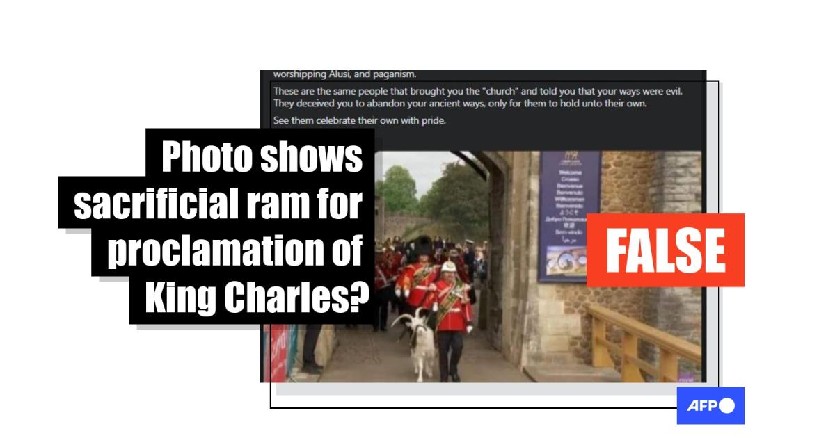 “This is the British carrying a white ram (intended for sacrifice) for the crowning and declaration of Prince Charles as King of England,” reads a post published on September 14, 2022, and shared more than 200 times.