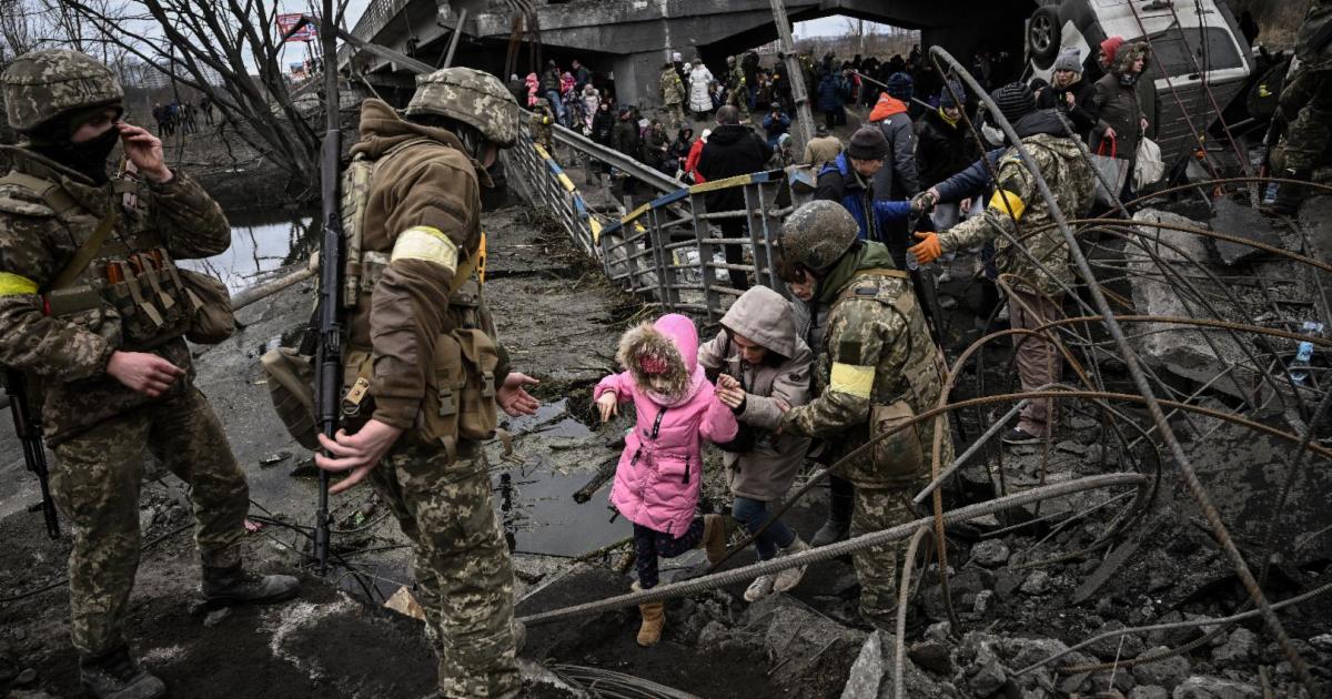 The caption says: "Pedestrians cross a destroyed bridge as they evacuate the city of Irpin, northwest of Kyiv, on March 6, 2022, 11 days after Russia launched a military invasion on Ukraine."