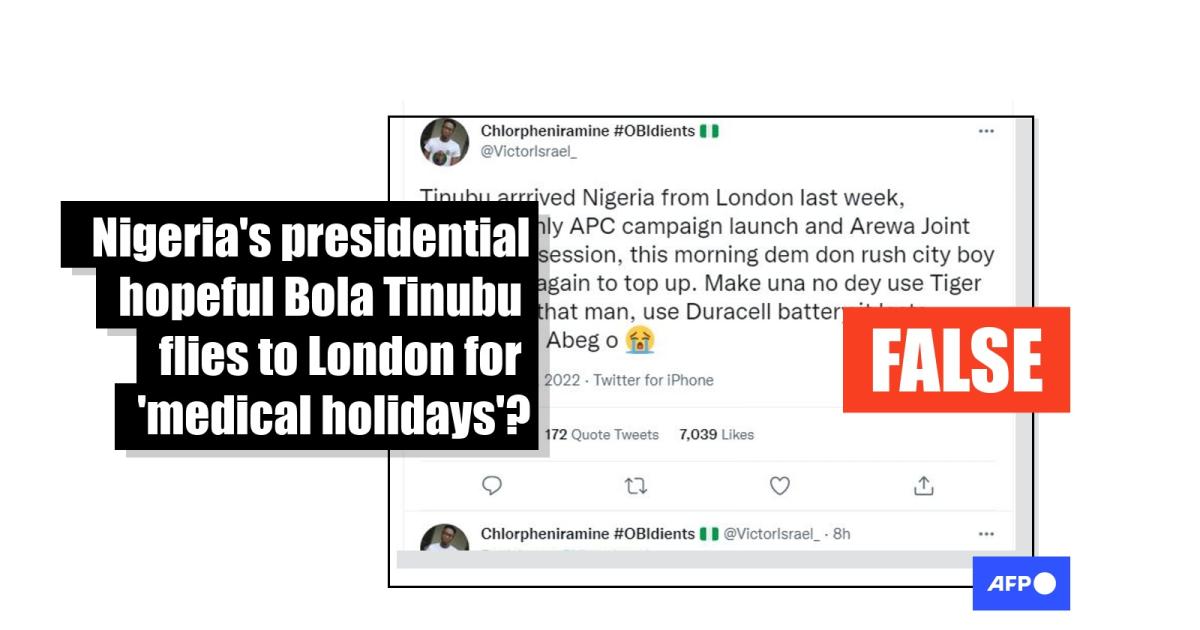 Post falsely claims Nigerian presidential candidate Bola Tinubu back in London for ‘medical holiday’