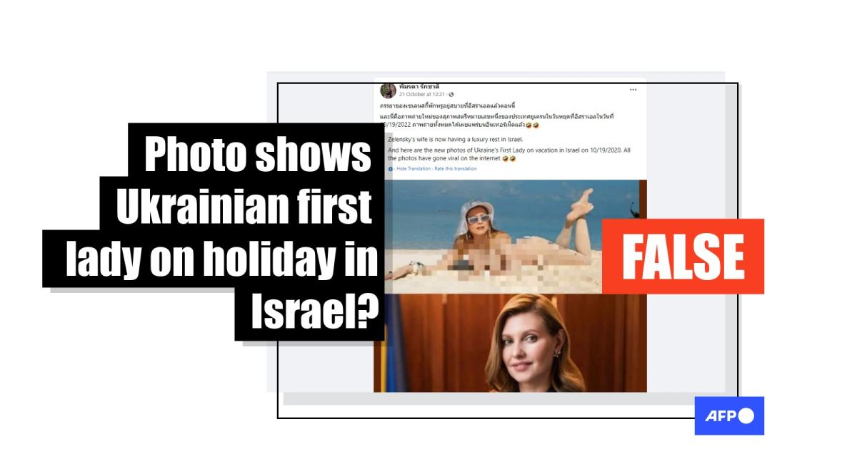 The collage of an image of a woman lying on a beach -- with parts of her body censored -- and a headshot photo of Ukrainian First Lady Olena Zelenska was posted here on October 21, 2022.