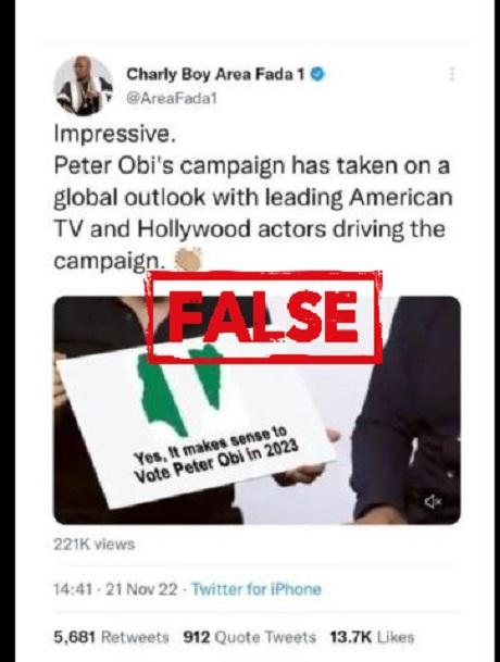It was also shared on Twitter by popular Nigerian musician Charles Chukwuemeka Oputa and retweeted more than 5,000 times by some of his 159,000 followers before being deleted. Charly Boy, as he is widely known, is one of the Nigerian celebrities supporting Obi.
