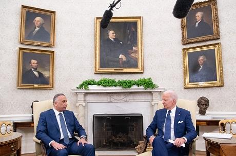 The original photo shows Biden sitting beside Al-Kadhimi. In both the original and altered photos, Biden can be seen holding a piece of white paper, with a stack on the table to his left.
