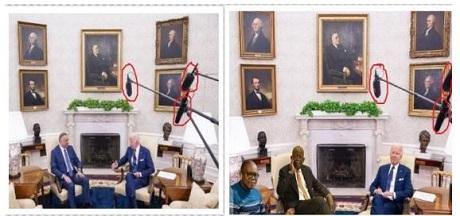 In both the original and altered photos is a collection of artworks. They include portraits of former US presidents as well as bronze busts of Robert Kennedy and Martin Luther King Jr.