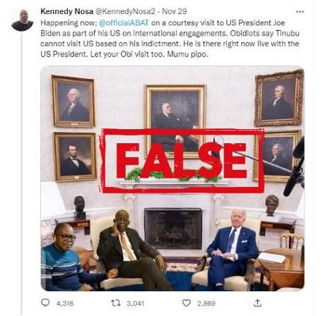 “Happening now: @officialABAT on a courtesy visit to US President Joe Biden as part of his US on international engagements. Obidiots say Tinubu cannot visit US based on his indictment. He is there right now live with the US President. Let your Obi visit too. Mumu pipo (sic),” reads a tweet published on November 29, 2022.