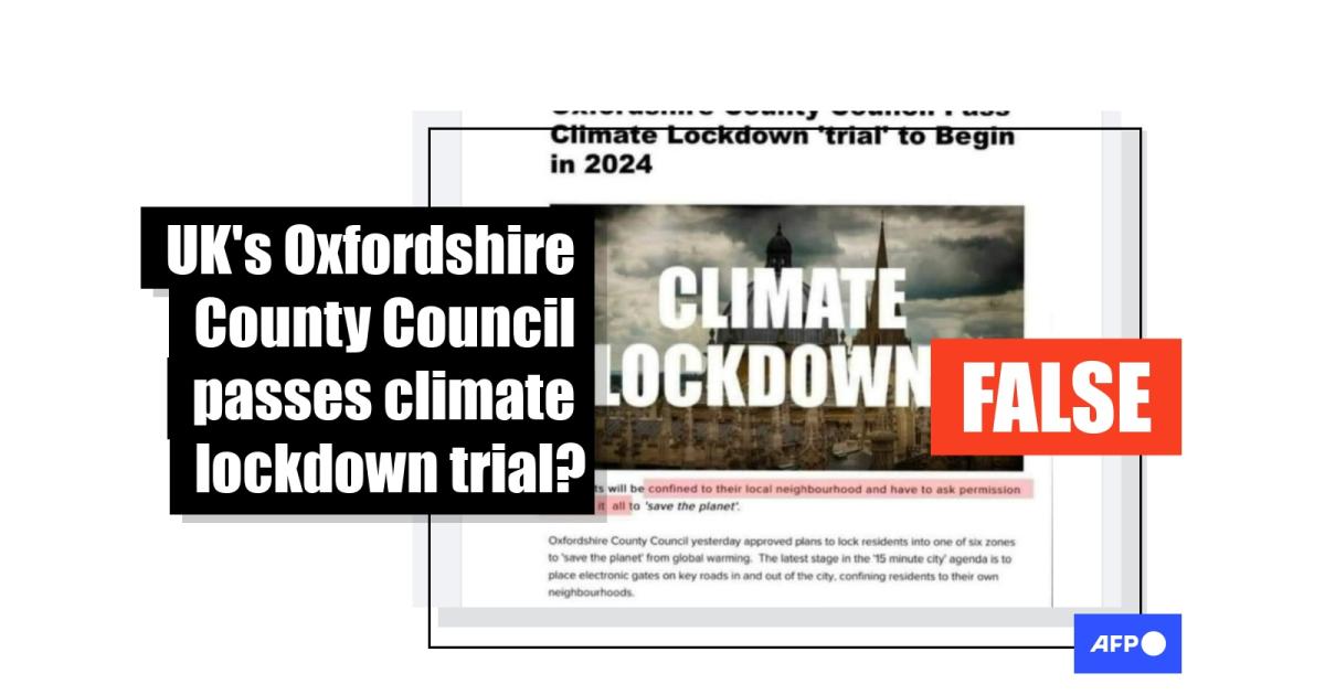 Social media users shared a screenshot of a misleading article titled "Oxfordshire County Council Pass Climate Lockdown 'trial' to Begin in 2024".