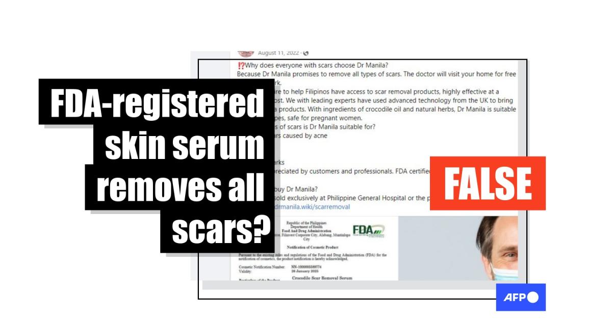 An image included in the post purportedly shows certification from the Philippines' Food and Drug Administration (FDA) for a product called "Crocodile Scar Removal Serum" and a shot of the product.
