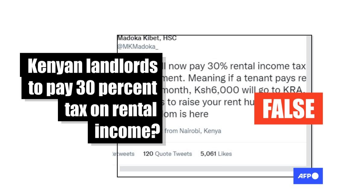 “LANDLORDS will now pay 30% rental income tax to this new government. Meaning if a tenant pays rent Ksh20,000 per month, Ksh6000 will go to KRA. Expect landlords to raise your rent hustlers Tighten your belts, freedom is here (sic),” reads the tweet published on November 21, 2022, which has been retweeted more than 2,000 times.