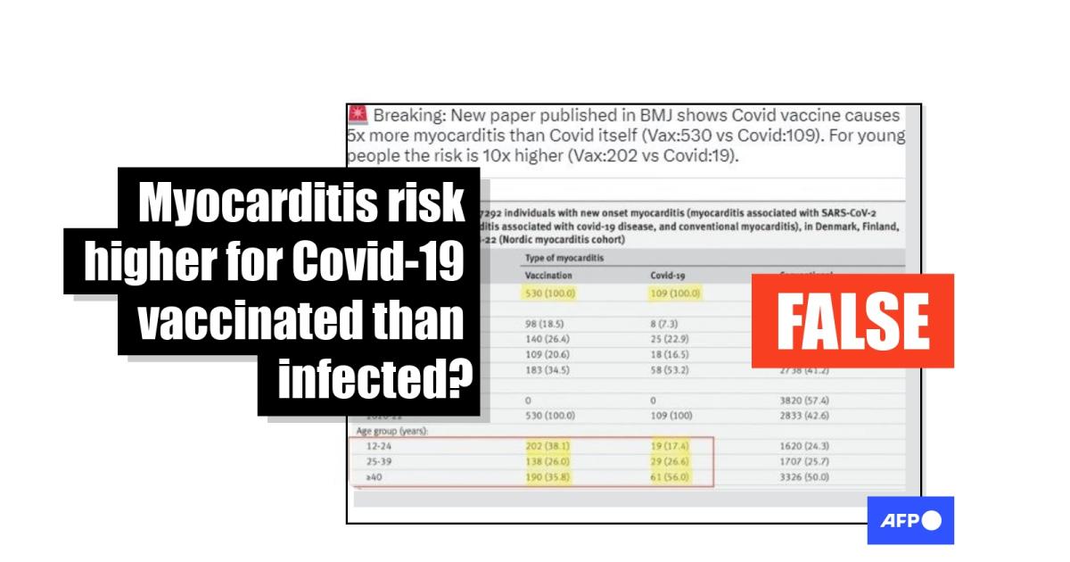 "This is an incorrect way to use our study," Anders Husby of the Statens Serum Institute in Denmark told AFP. "Our manuscript does not calculate the 'risk of myocarditis' by different kinds of exposure. Our current manuscript investigates the clinical outcomes of myocarditis cases."