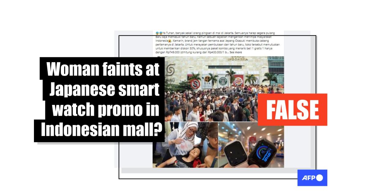 The Facebook post, which has been shared more than 50 times, shows three images: one of crowds seemingly outside the Grand Indonesia shopping mall in Jakarta, a second of a fainting woman and a third of someone holding two wristwatches.