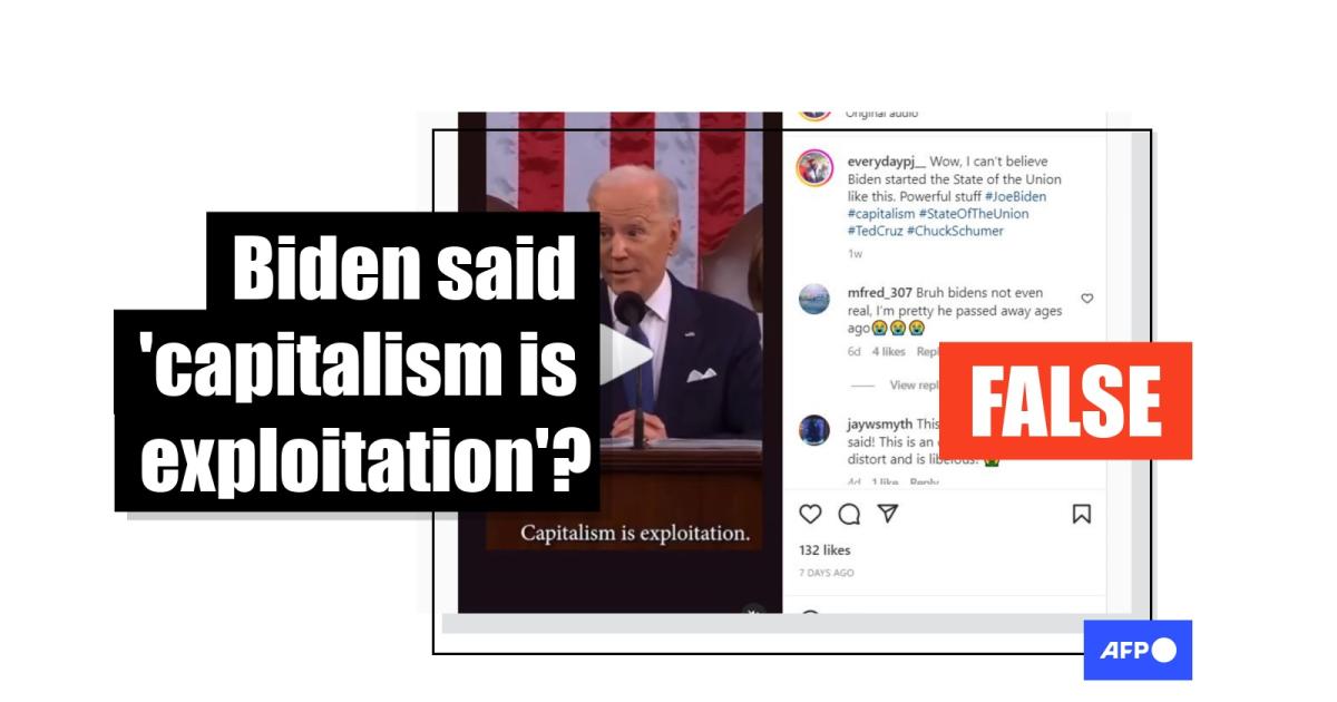 "Wow, I can't believe Biden started the State of the Union like this. Powerful stuff," says the text accompanying a February 8, 2023 Instagram video in which he appears to make the statement about capitalism, followed by wild cheers. The same segment was shared on TikTok here and here.