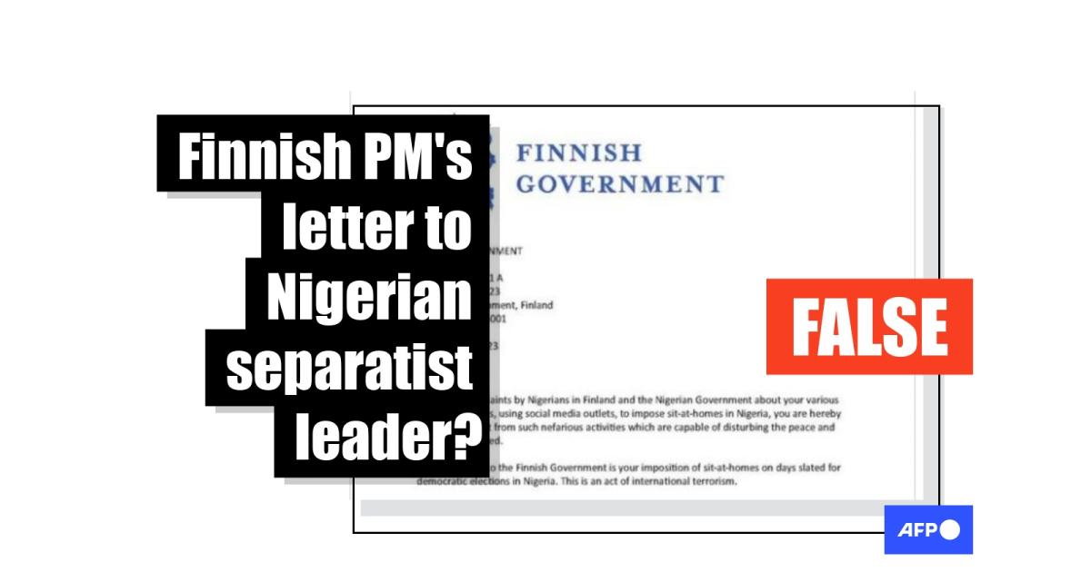 Letter shared online from Finnish PM to Nigerian separatist leader is fabricated