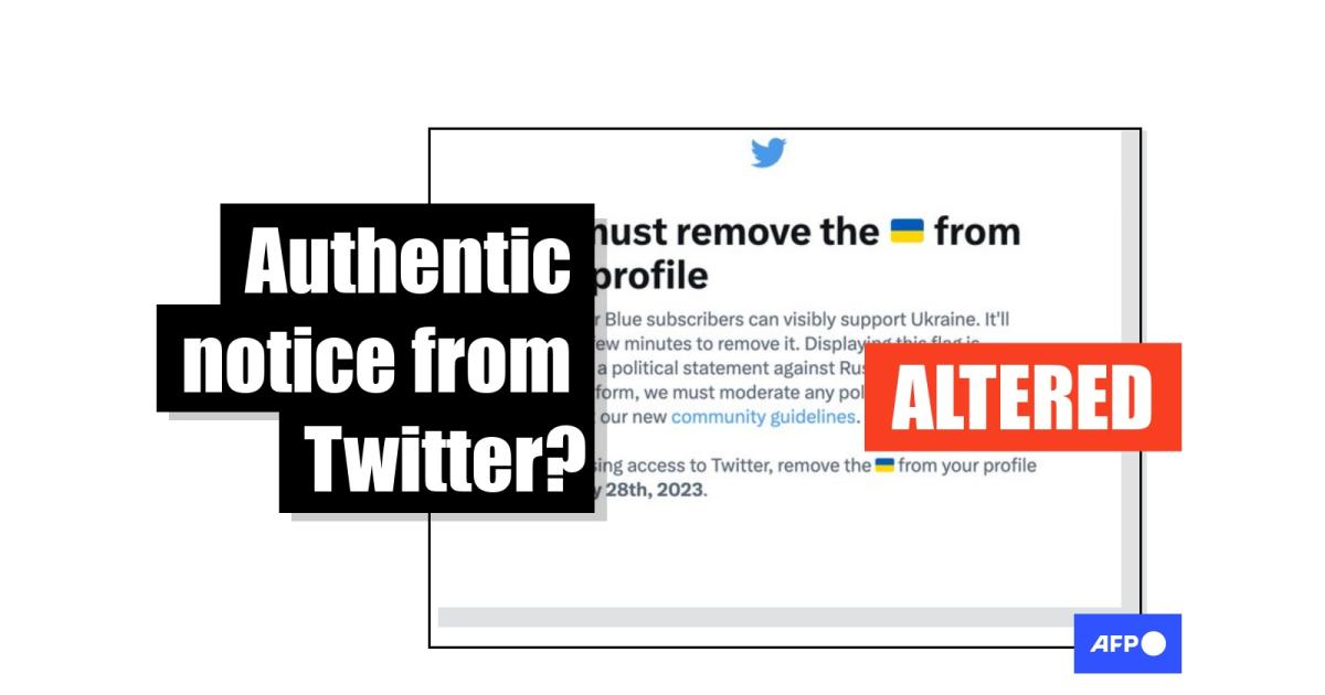 "Only Twitter Blue subscribers can visibly support Ukraine," says the text on what looks like an authentic message from Twitter telling users they "must remove" the Ukrainian flag emoji from their profiles by February 28, 2023 to avoid losing access to the social media site.
