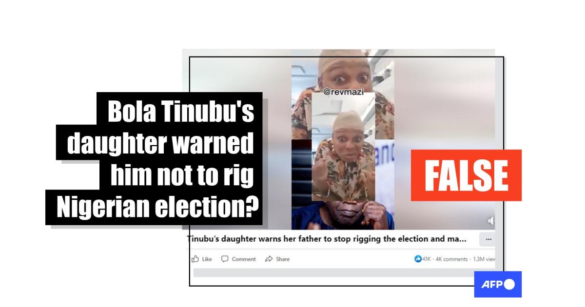 A day before Nigeria’s electoral commission declared Bola Tinubu the winner of the presidential race, a Facebook page published a video with claims that it showed his daughter warning him not to rig the election. But this claim is false: the woman in the video is not Tinubu’s daughter – she is Nigerian activist Adetoun Onajobi. AFP Fact Check debunked another claim about Onajobi and the video before the election.