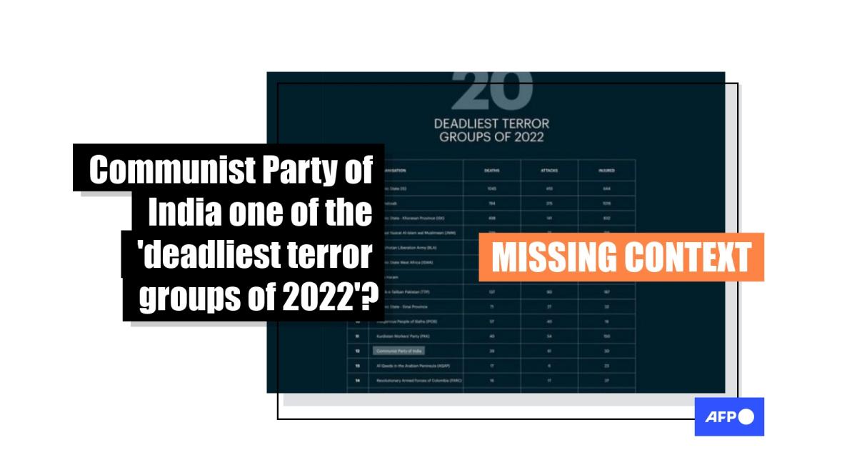 Its caption reads: "On March 14, Institute for Economics & Peace released its Global Terrorism Index 2023. In its report, the organization listed the twenty most deadly terrorist organizations globally. India’s Communist Party of India (CPI) made it to the list in 12th place."