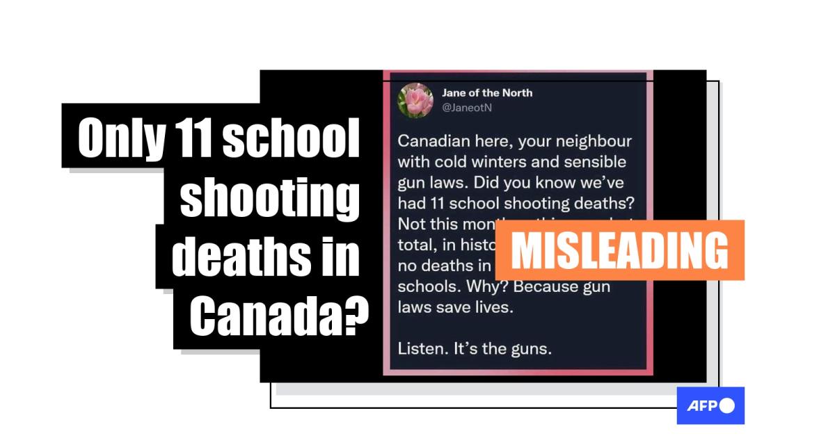"Canadian here, your neighbour with cold winters and sensible gun laws. Did you know we've had 11 school shooting deaths?" says text repeatedly shared on Facebook. "Not this month or this year, but total, in history. And absolutely no deaths in elementary schools. Why? Because gun laws save lives."