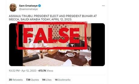 “ASIWAJU TINUBU. PRESIDENT ELECT AND PRESIDENT BUHARI AT MECCA, SAUDI ARABIA TODAY, APRIL 12, 2023(sic)”, reads a tweet published on April 12, 2023.