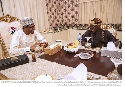 The picture (archived here), published by major Nigerian media outlets, was taken by Buhari’s personal photographerSunday Aghaeze. It shows Buhari hosting Tinubu during the breaking of fast at the presidential villa in Abuja on May 10, 2019.