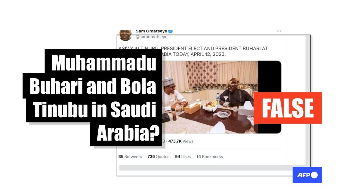 An image has been shared on Twitter with claims that it shows Nigeria’s president-elect Bola Tinubu and outgoing leader Muhammadu Buhari in Saudi Arabia on April 12, 2023. But while both men announced separately they were indeed heading to Saudi Arabia this month, the claim is nonetheless false: the picture was taken in 2019 in Nigeria’s capital Abuja when Buhari met Tinubu to break the fast during Ramadan.