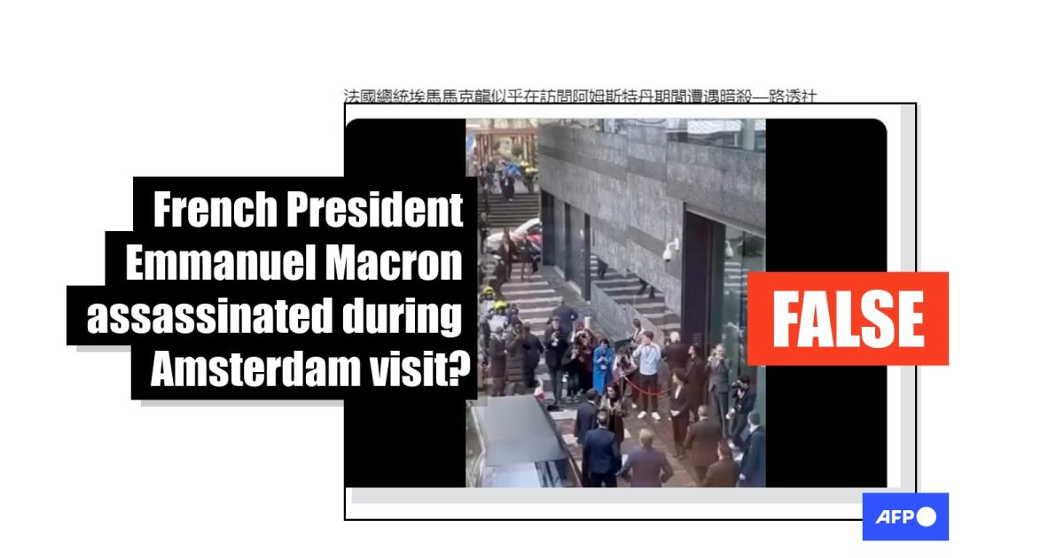 "French President Emmanuel Macron appears to have been assassinated during Amsterdam visit -- Reuters," reads the caption written in traditional Chinese characters.