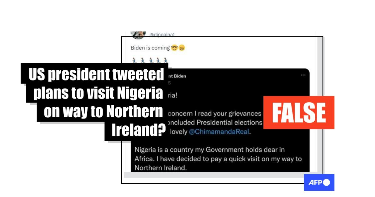 Social media users have alleged that US President Joe Biden tweeted plans to briefly visit Nigeria on his way to an official visit to Northern Ireland in April 2023. The claim started circulating days after Nigerian author Chimamanda Ngozi Adichie wrote an op-ed addressed to Biden condemning the United States for congratulating Nigeria’s president-elect Bola Tinubu on his victory at the polls. But the claim is false: there is no tweet on Biden’s official Twitter account announcing the visit. The West African country did not figure on Biden’s itinerary either before or during his trip to Northern Ireland. Additionally, his official public calendar does not list an April visit to Nigeria.