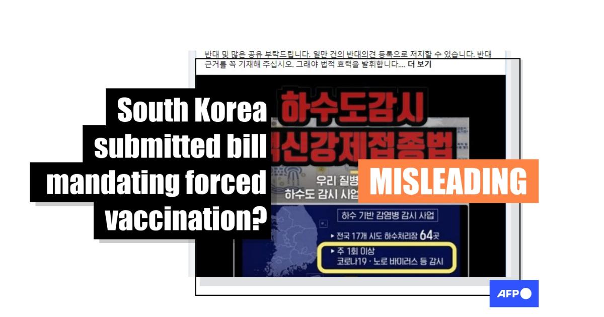 "An evil law that attempts to introduce emergency forced vaccinations in areas where viruses were found in sewer water using WHO inspection methods," reads the Korean-language claim shared here on Facebook on April 20, 2023.