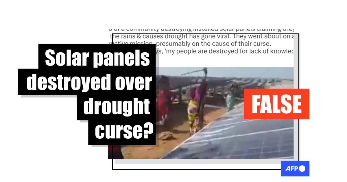 "Video of a community destroying installed solar panels claiming they stop the rains & causes drought has gone viral. They went about on a destructive mission, presumably on the cause of their curse," reads the caption of a tweet published on April 29, 2023.