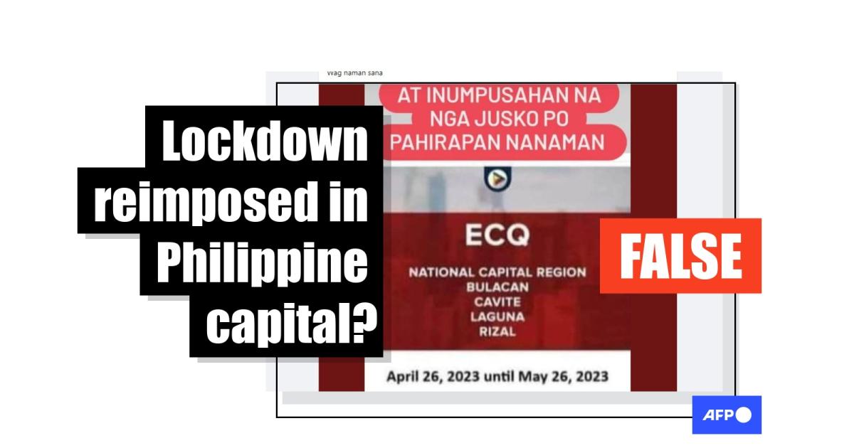 The graphic, which features the logo of Philippine broadcaster PTV, says there will be an Enhanced Community Quarantine (ECQ) order between April 26 and May 26, 2023 in the National Capital Region -- also know as Metro Manila -- and neighbouring Bulacan, Cavite, Laguna and Rizal provinces.