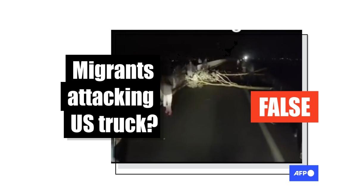 "Thank Biden for this," says text over one iteration of the video shared May 26, 2023 on TikTok. "Migrants laying road blocks and attacking a truck at night. This is what the Democrat party voted for."